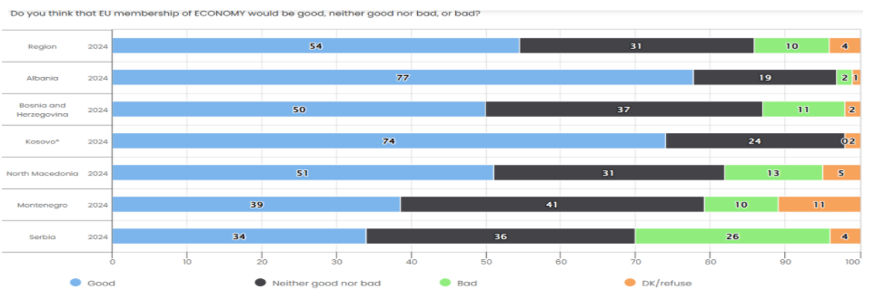 Bölgədə milli iqtisadiyyatların Aİ-yə inteqrasiyası ilə bağlı ictimai rəy ümumilikdə qənaətbəxşdir – altı ölkədən respondentlərin 85%-i Aİ-yə üzvlüyün iqtisadi baxımdan müsbət bir hal olduğu qənaətindədir (Diaqram 1.). Lakin regionun media mühitindəki zəiflikləri bizi ehtiyatlı olmağa vadar etməlidir. Regionda faktların yoxlanılması üzrə yetərli missiyaların olmaması və Aİ və NATO-nun bürokratik strukturlarının yaratdığı səbəblər, yaxın illərdə ictimai rəyin dəyişkən olacağına işarə edir. Bundan əlavə, ABŞ-ın xaricdəki vətəndaş cəmiyyəti və medianı dəstəkləmək maraqlarının azalması müşahidə olunur və bu tendensiya, çox güman ki, vətəndaş sektorunun fəaliyyət imkanlarının daralmasına gətirib çıxaracaq. İctimai rəyin manipulyasiyası nəticəsində baş verə biləcək mənfi təsirləri aradan qaldırmaq və qarşısını almaq üçün bir neçə tövsiyə nəzərdən keçirilə bilər.