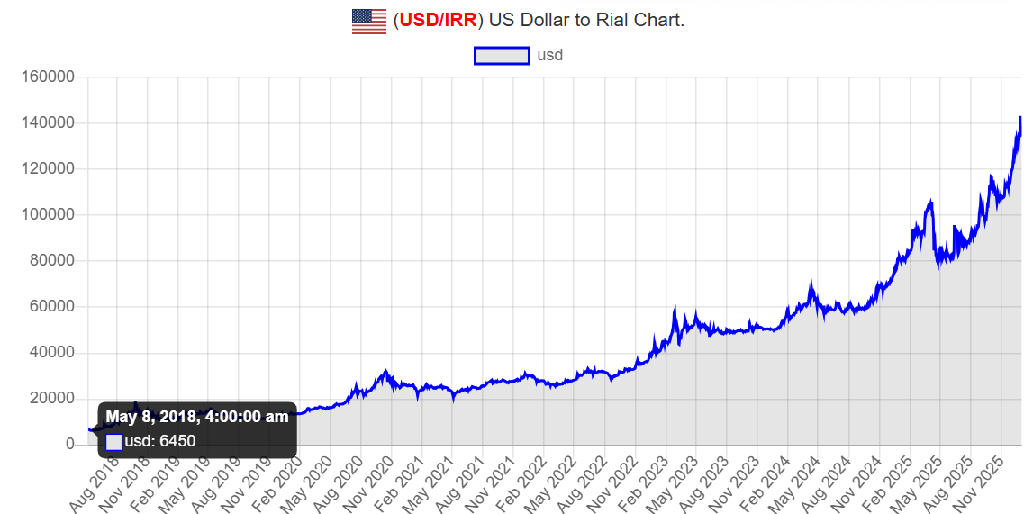 If we examine the Bonbast portal, which reflects the real market value of the Iranian rial inside Iran, we see that while on May 18, 2018, 1 US dollar was equal to 64,500 rials, this figure has now reached 1,350,500 rials (Bonbast 2026).