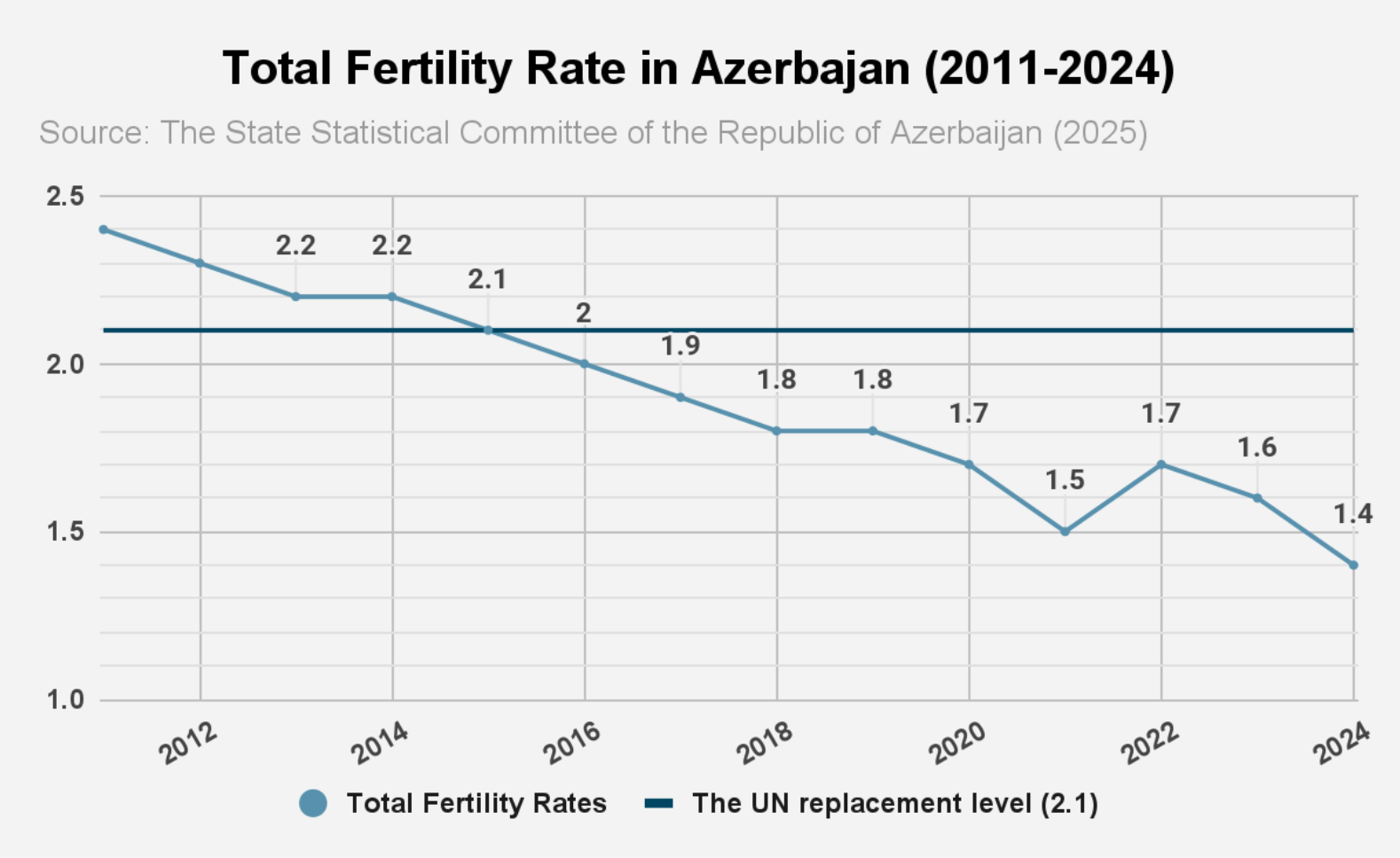 Since 2011, the total fertility rate in Azerbaijan has declined sharply from 2.5 to 1.4 in 2024. As illustrated in the chart below, the rate has remained below the United Nations replacement level of 2.1 (UN 2025) since 2015 (Chart 1).